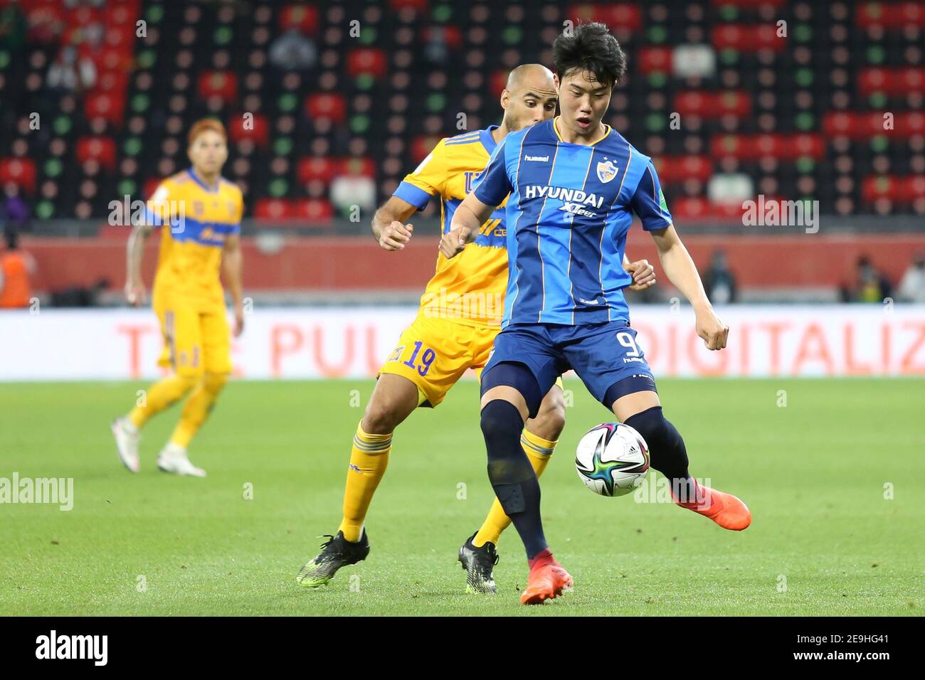 Doha Qatar February 04 Ji Hyeon Kim Of Ulsan Hyundai And Guido Pizarro Of Tigres Uanl During Tigres Uanl V Ulsan Hyundai Fc On February 4 2021 In Doha Qatar Photo By